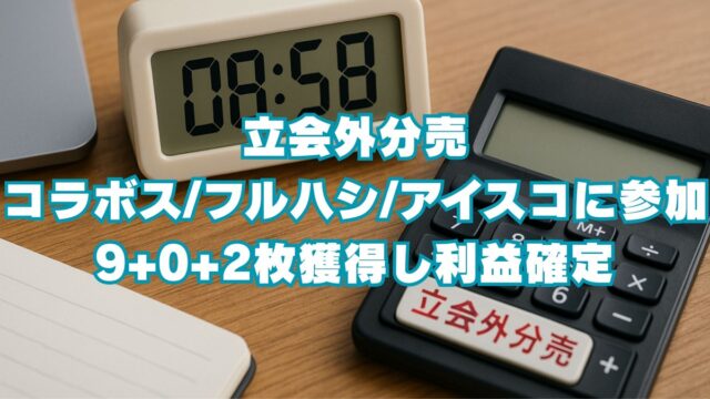 株式投資 立会外分売 コラボス・フルハシEPO・アイスコに参加。9+0+2枚獲得し利益確定 2025年11月28日 jump-fire-man とりあえず退職しちゃいました実録 退職後の不安定な収入・資産を補うため実践している中の1つが「立会外分売への参加」。 私自身は2022年から本格的に参戦開始。 実 …