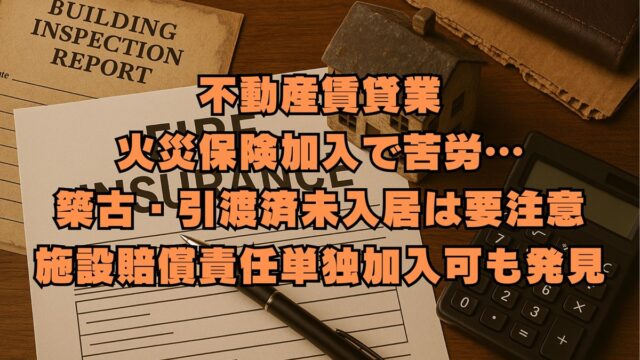 自営業の構築 賃貸用不動産の火災保険に加入。築古・引渡済などで苦労した話、施設賠償責任単独加入可の会社情報 2026年1月12日 jump-fire-man 戸建賃貸として運用するために、物件を購入して先日引き渡しとなりました。 信頼している保険代理店の営業マンとしばらく連絡が取れなかったこ …