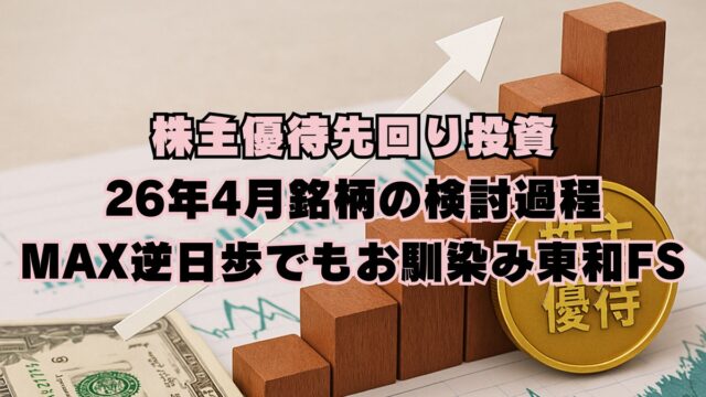 株主優待先回り投資 株主優待先回り投資 26年4月銘柄の検討過程を公開! 2025年12月15日 jump-fire-man とりあえず退職しちゃいました実録 株主優待銘柄を権利確定の約4か月前に購入し、権利を取得せずに売却するというマイルールにて『株主優待先回り投資』を実践しています。 ~1 …