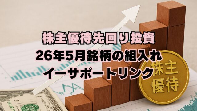株主優待先回り投資 株主優待先回り投資、26年5月銘柄を組入れ 2026年1月24日 jump-fire-man 株主優待先回り投資の経過報告です。 1月末権利付最終日は1/28(水)ですが、その前営業日である1/27(火)までに「5月権利株主優待銘柄を先回り購入」というルールで運用して …