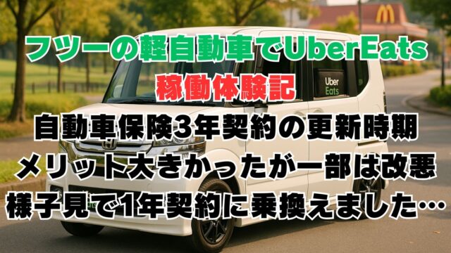 軽乗用車Uber 軽乗用車Uber稼働記。3年契約していた自動車保険を更新。1年に乗換え 2026年4月11日 jump-fire-man UberEats軽乗用車での稼働記です。 2023年2月に黒ナンバー対応の自動車保険に加入しました。 当時はネット型各社での取り …