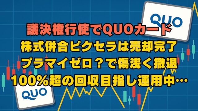 株式投資 議決権行使でクオカード、ピクセラをプラマイゼロ?で売却 2026年2月14日 jump-fire-man 議決権行使でもれなくQUOカードがいただけていた情報のあった銘柄で、元本回収・逃げ切りを狙ってみるシリーズ。 10:1併合が予定されて …