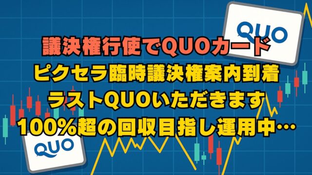 株式投資 ピクセラから最後の臨時議決権行使でクオカード500円の案内到着 2026年2月27日 jump-fire-man 議決権行使でもれなくQUOカードがいただけていた情報のあった銘柄で、元本回収・逃げ切りを狙ってみるシリーズ。 「6731 ピクセラ」よ …