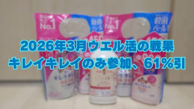 耳寄り情報 26年3月ウエル活で実際に購入した商品とお得度確認 2026年3月22日 jump-fire-man 26年3月もウエル活、ピンポイントに少しだけ取り組みました! 活用したキャンペーンはキレイキレイ系の1つのみ。 ウエルシ …
