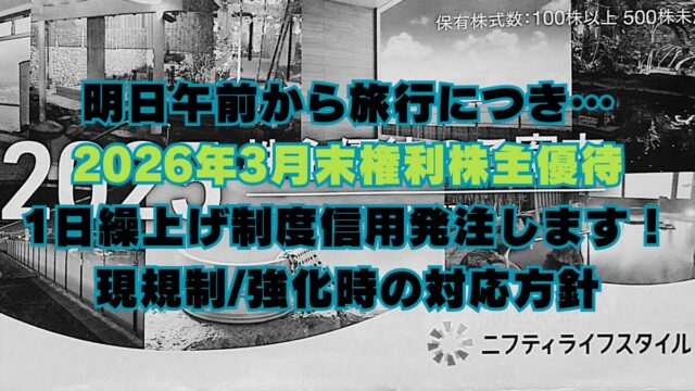 株主優待取得 個人的な事情で…2026年3月末制度クロス1日早く戦略チェックし仕掛けます! 2026年3月25日 jump-fire-man 2026年3月末権利付最終日は、明後日3/27(金)。 本来なら前日である3/26夜の記事で、 『規制変化状況を全体確認 → 個 …