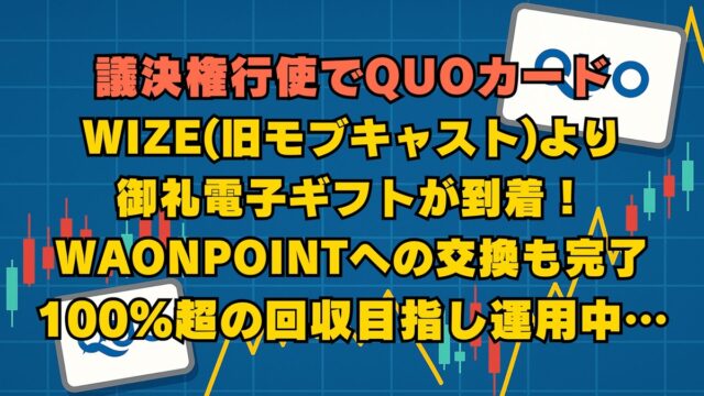 株式投資 議決権行使でWIZE(旧モブキャスト)の電子ギフト到着、WAONPOINTに出来た 2026年4月4日 jump-fire-man 議決権行使でもれなくQUOカードがいただけていた情報のあった銘柄で、元本回収・逃げ切りを狙ってみるシリーズ。 「3664 WIZE(旧 …