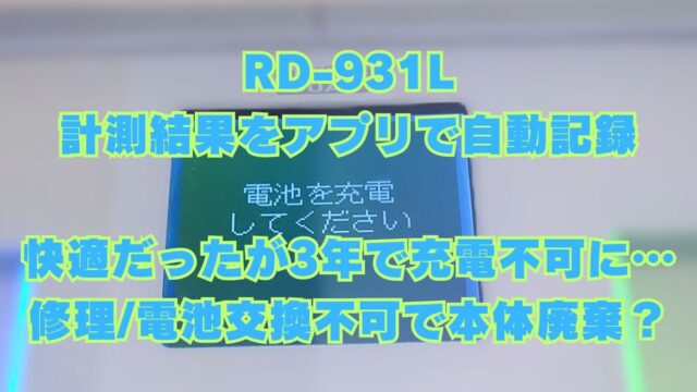 耳寄り情報 RD-931L充電出来ない?充電池寿命=本体ごと廃棄という点は購入前に把握すべき実体験… 2026年4月10日 jump-fire-man タニタ体組成計「RD-931L」という商品を2022年12月に購入し、とても快適な計測・自動記録ライフを満喫していました。 ところがこ …
