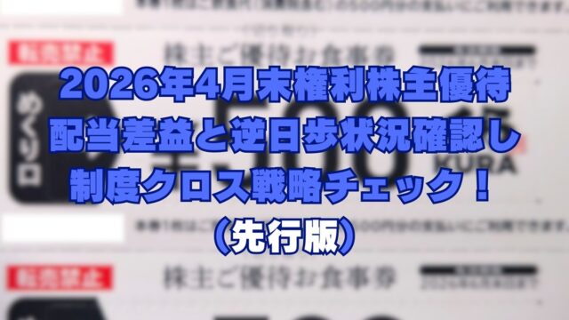株主優待取得 2026年4月末株主優待銘柄の制度クロス、差益コミで戦略チェック!(先行版) 2026年4月18日 jump-fire-man 2026年4月末権利付最終日は再来週4/27(月)です。 逆日歩日数は1日。 まだ丸々1週間分の営業日が残っていますので条件や状 …