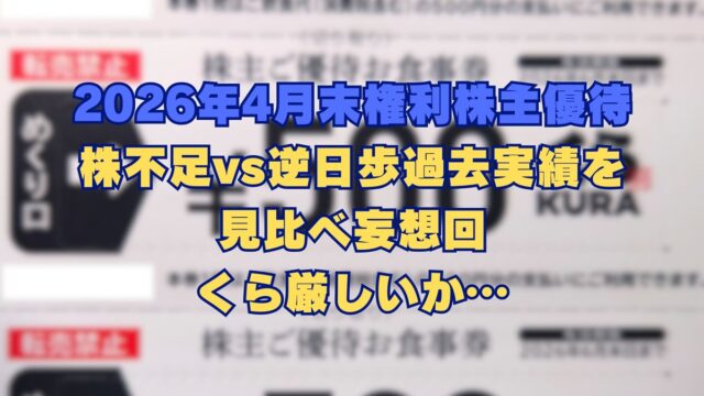株主優待取得 2026年4月末株主優待銘柄の制度クロス、差益コミで戦略チェック!(直前版) 2026年4月24日 jump-fire-man 2026年4月末権利付最終日は週明け4/27(月)です。 逆日歩日数は1日。 戦略チェックした先週末時点から『大きく状況変化した …