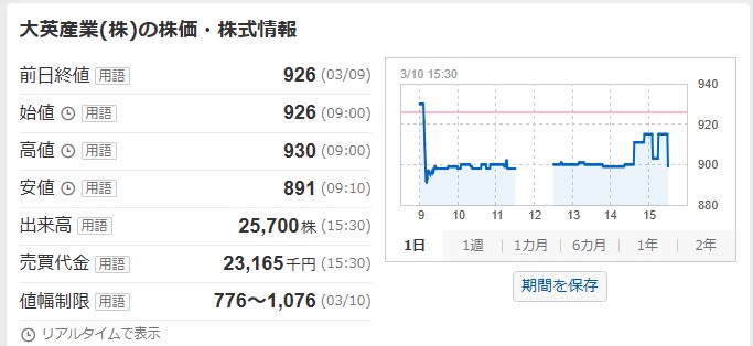 大英産業の当日値動きを見ると↓