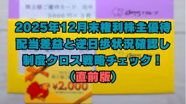 株主優待取得 2025年12月末株主優待銘柄の制度クロス、差益コミで戦略チェック!(先行版) 2025年12月20日 jump-fire-man 2025年12月末権利付最終日は来週12/26(金)です。 逆日歩日数は6日。 まだ数営業日残っていますので条件や状況変動してし …