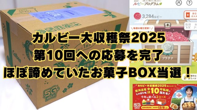 耳寄り情報 カルビー大収穫祭2025、最終第10回への応募を完了。初のお菓子BOX到着! 2025年12月7日 jump-fire-man とりあえず退職しちゃいました実録 美味しいじゃがいも2kgの抽選がほぼ毎週行われる『カルビー大収穫祭2025キャンペーン』の開催期間中です。 現在は第10回応募期間に入 …