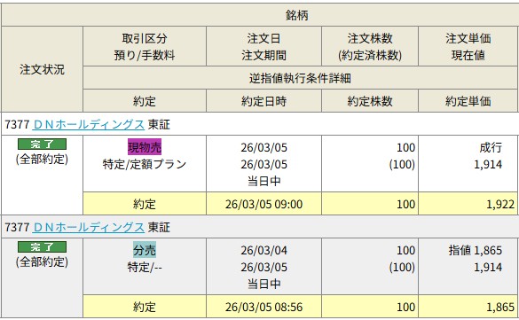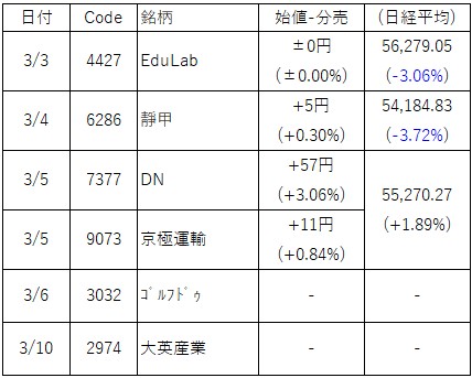 3/5(水)は「7377 DNホールディングス」と「9073 京極運輸商事」の立会外分売実施日でした。