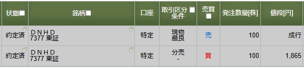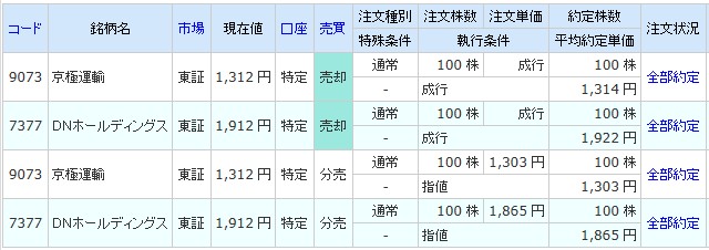 立会外分売DNHDと京極運輸商事に参加。5+1枚獲得し利益確定
