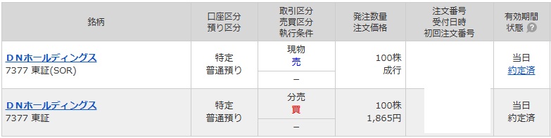 立会外分売 DNホールディングスに参加し5枚獲得
