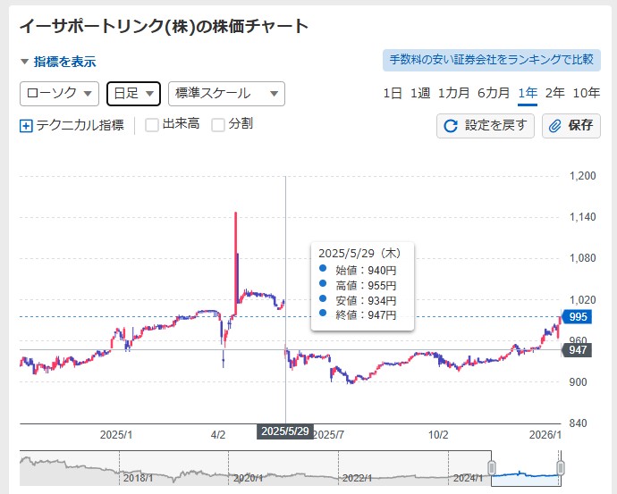 5月権利銘柄の採用候補、イーサポートリンク。過去の推移は?