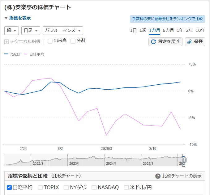 直近1か月の安楽亭と日経平均の値動きを比較してみると↓