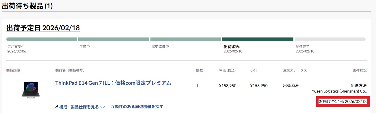 Lenovo公式で納期4週間以上と書かれていたノートPCを発注しましたが、実際には約2週間で到着見込みとなりました。