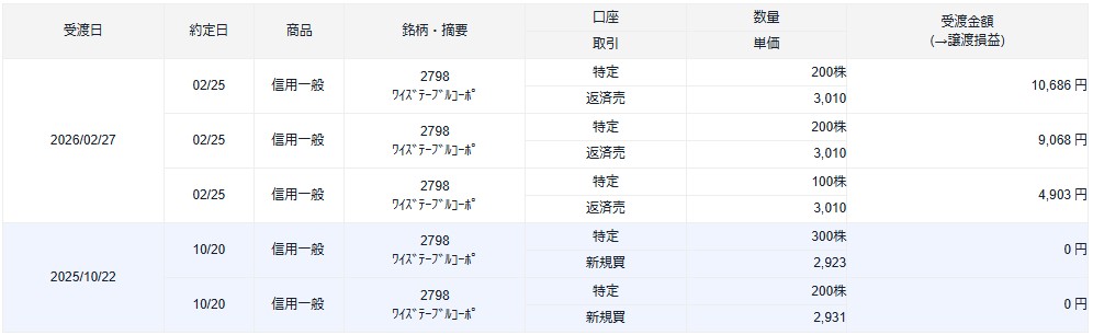 2026年2月は「2798 ワイズテーブルコーポレーション」を組み入れていました。