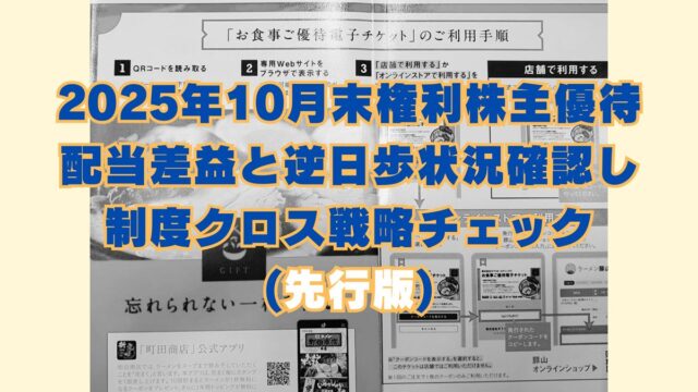 株主優待取得 2025年10月末株主優待銘柄の制度クロス、差益コミで戦略チェック!(先行版) 2025年10月24日 jump-fire-man とりあえず退職しちゃいました実録 2025年10月末権利付最終日は来週10/29(水)です。 逆日歩日数は4日。 まだ数営業日残っていますので条件や状況変動してし …