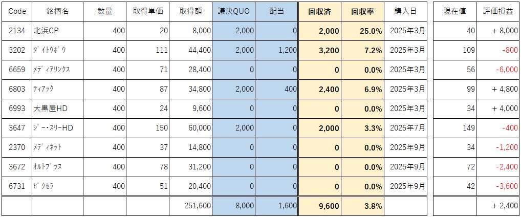 我が家での現在の保有銘柄と回収状況は以下です↓