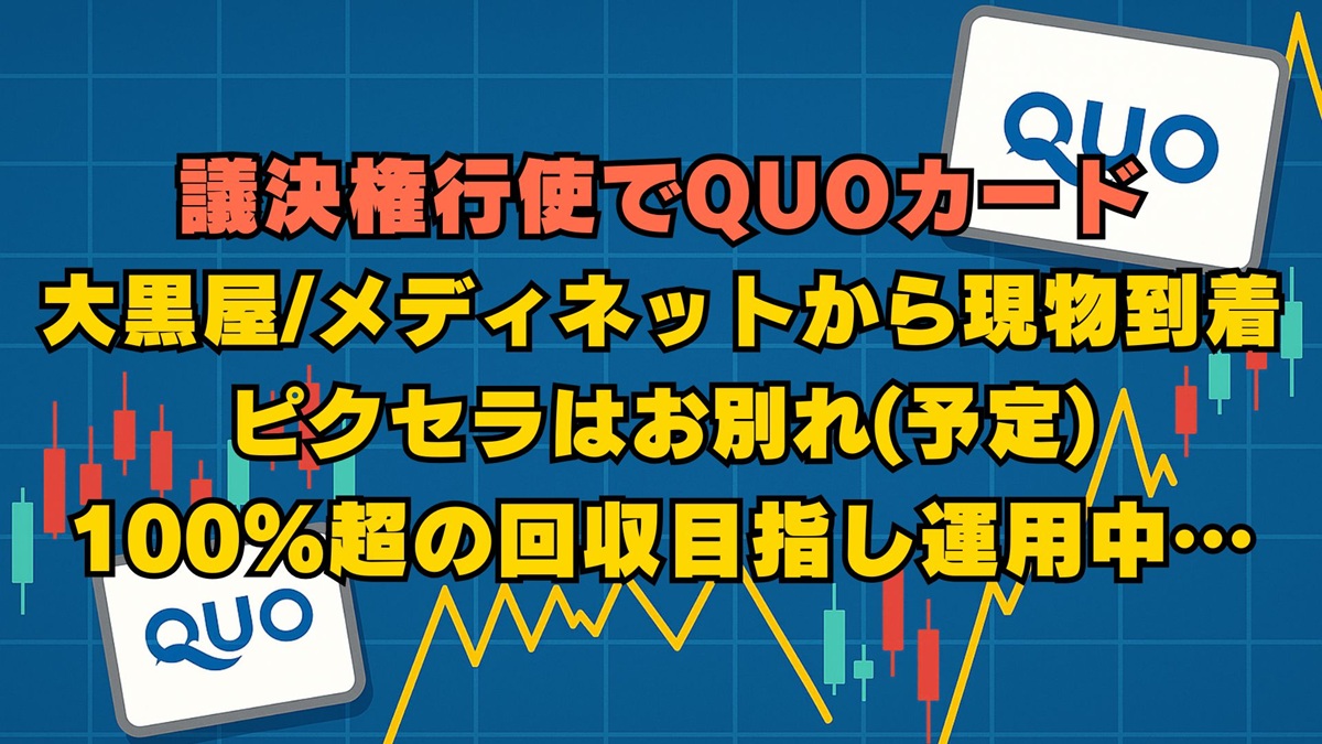 「6993 大黒屋HD」と「2370 メディネット」からそれぞれ臨時株主総会/定時株主総会の実施と、議決権を行使すると御礼としてQUOカードがいただける案内が到着、ありがたく行使しておきました。