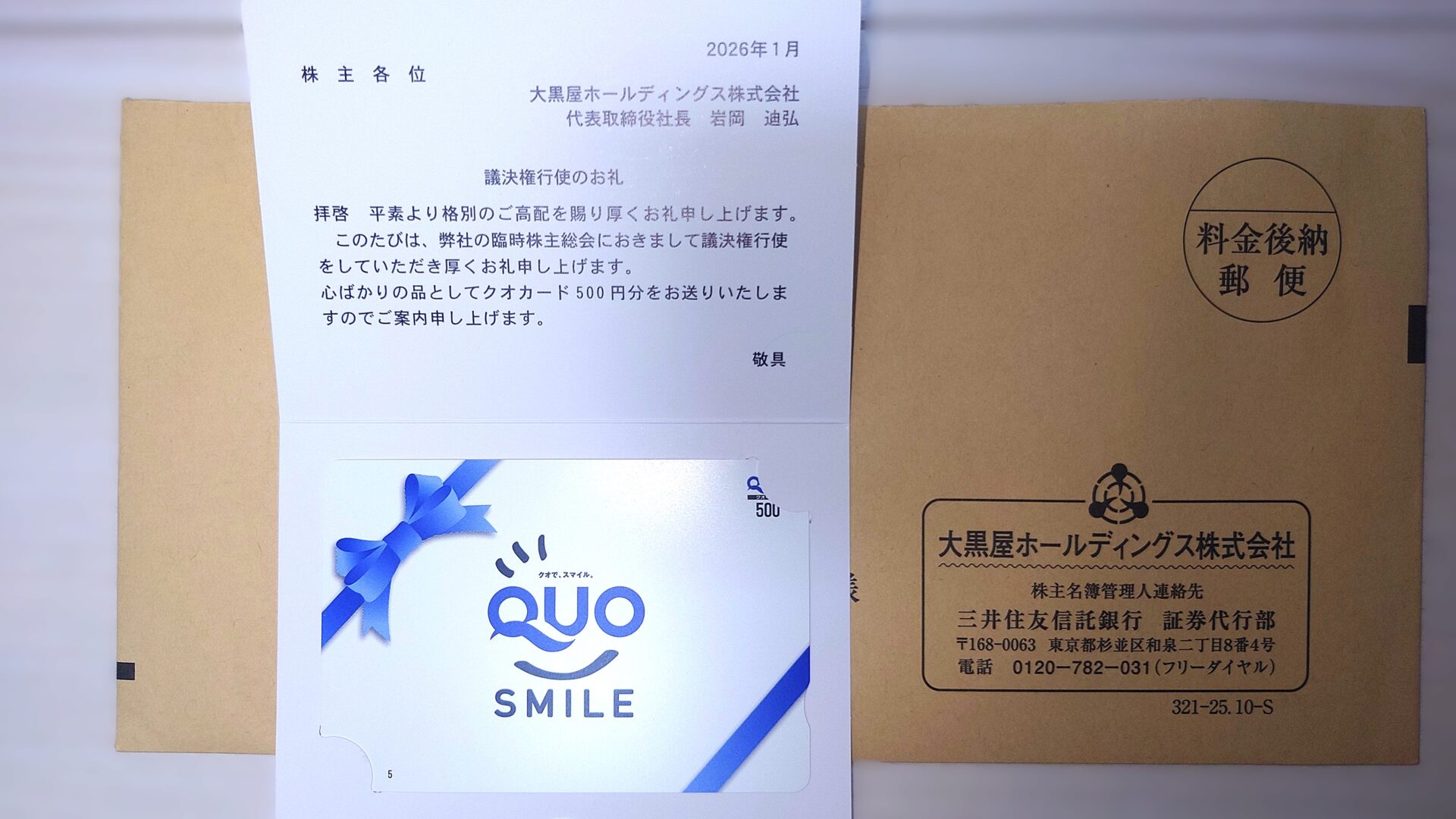 大黒屋HDから議決権行使のお礼QUOカードが到着!