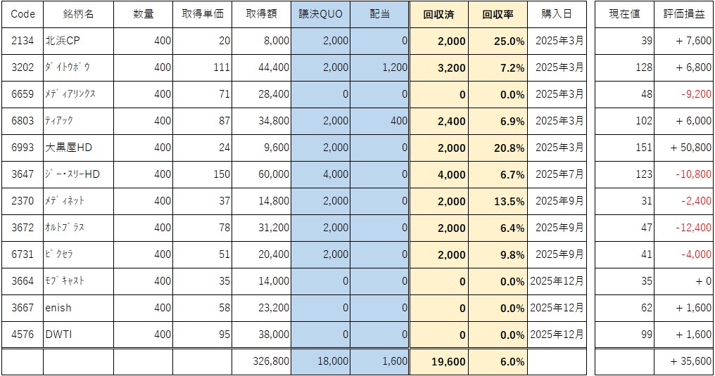 評価損益は大黒屋が突き抜けているおかげでプラスですが、本運用の目的はそこではないので気にしません。