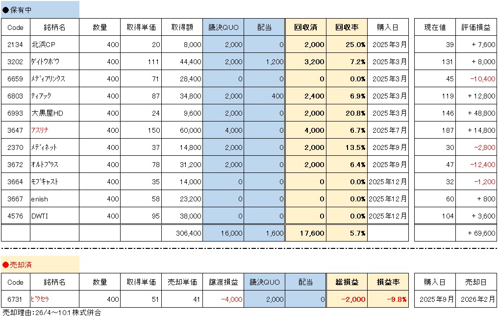 併合以降は「議決権行使QUOカード分で元本回収狙い」には向かない銘柄になったので…、大きな損失を出すことなく撤退出来て良かったです。