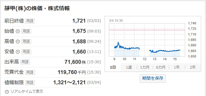 | 3/4 | 6286 | 靜甲 | +5円 | 54,184.83 (-3.72%) |