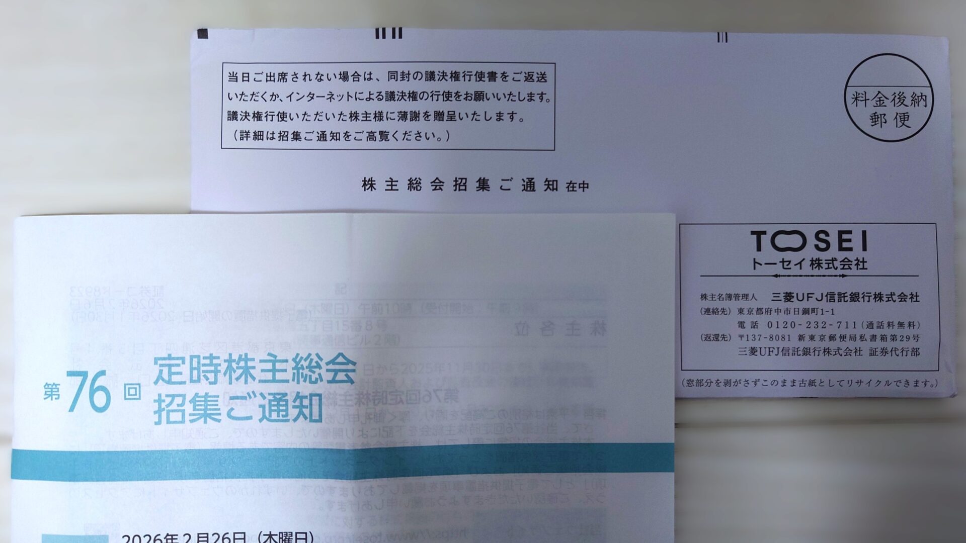 2025年11月権利を取得していた「8923 トーセイ」から、定時株主総会の招集通知が到着しました。