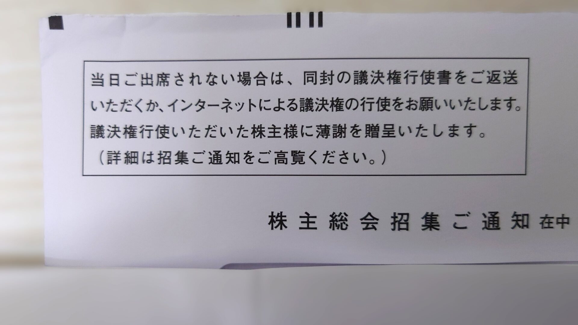 トーセイ定時株主総会招集通知が到着し、議決権行使で「薄謝」がいただけることが分かりましたが、行使者全員ではなく抽選でした…。