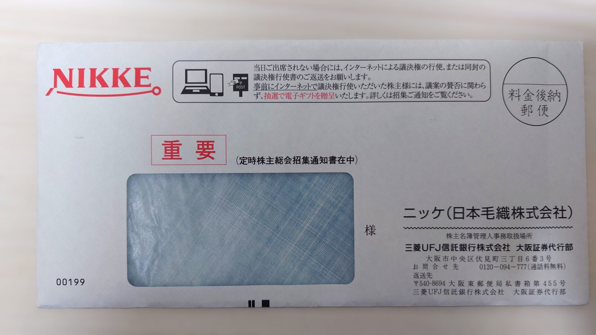 なお、たまたま同日に届いた「3201 ニッケ」定時株主総会招集通知の封筒には以下のように記載がありました↓