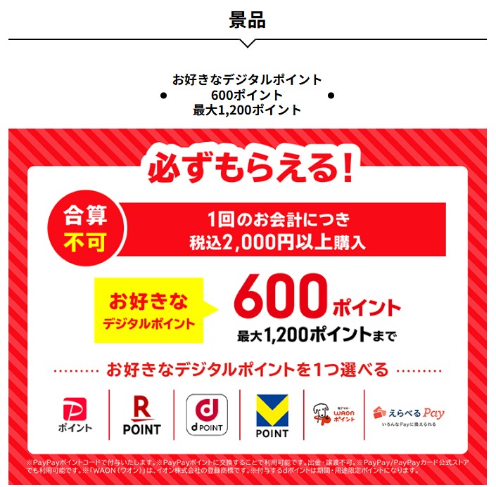 メーカー単独のキャンペーンではないので対象商品が広く、最大還元率となる5,000円分の組み合わせを作り易くて活用し易いキャンペーンとなっています。