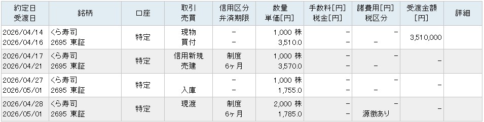 4/14に3,510円で買い → 4/17に3,570円で売りでクロス出来たので、貸株料・逆日歩分を相殺してトントンぐらいではあるのですが…。