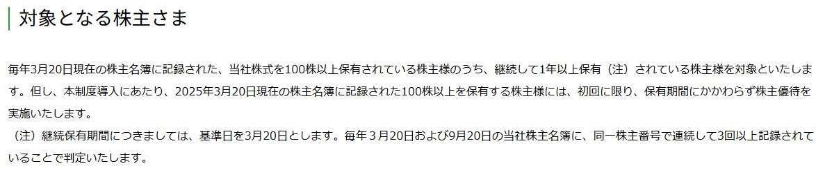 | Code | 銘柄名 | 最低株数 | 保有期間 |